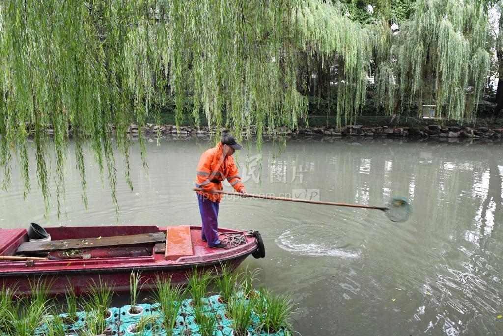 2021年10月13日,环卫工人在杭州市东河水面上打捞清理漂浮物和水草。