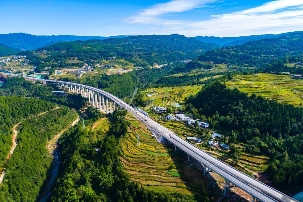 2021年10月13日,俯瞰镇(陕西镇巴县)广(四川广安市)高速王坪至通江段穿越四川省巴中市通江县,宛如一幅美丽乡村画卷。