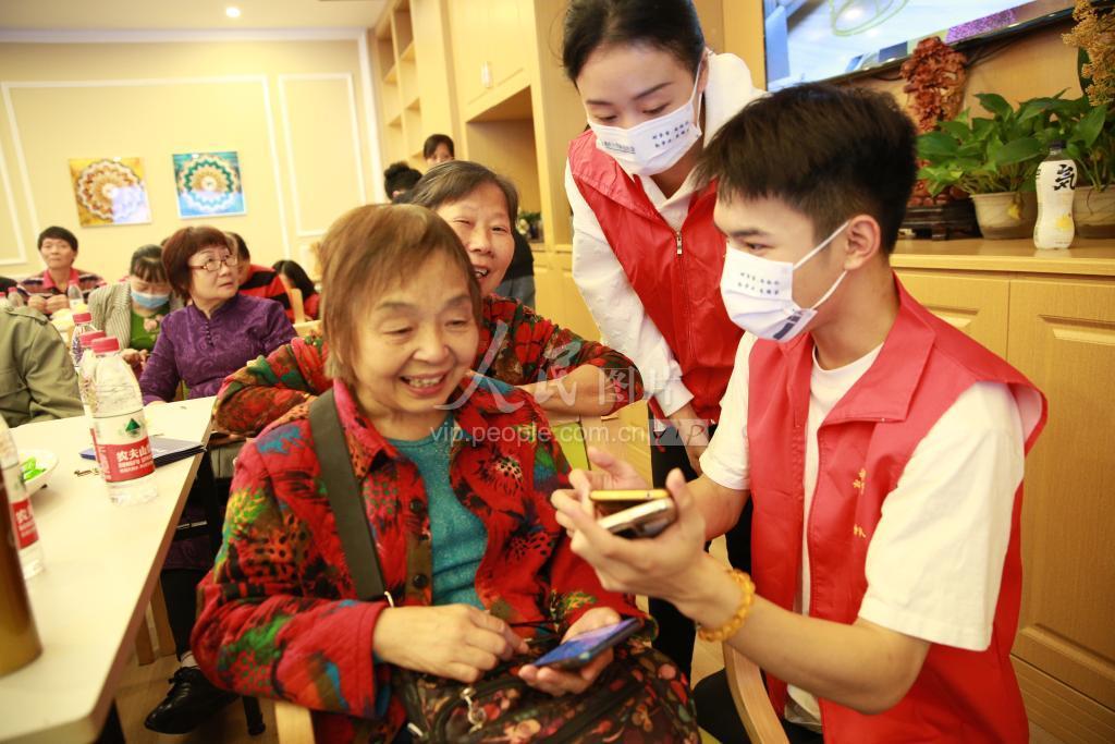 2021年10月14日,重庆市沙坪坝区磁器口街道养老服务中心,重庆大学研究生志愿者正在教老人使用智能手机。