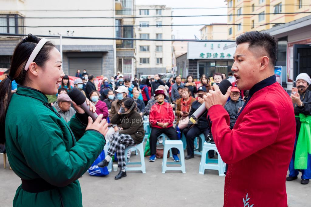 2021年10月14日,内蒙古呼和浩特市玉泉区新时代文明实践志愿者在为社区老年人表演戏曲二人台。