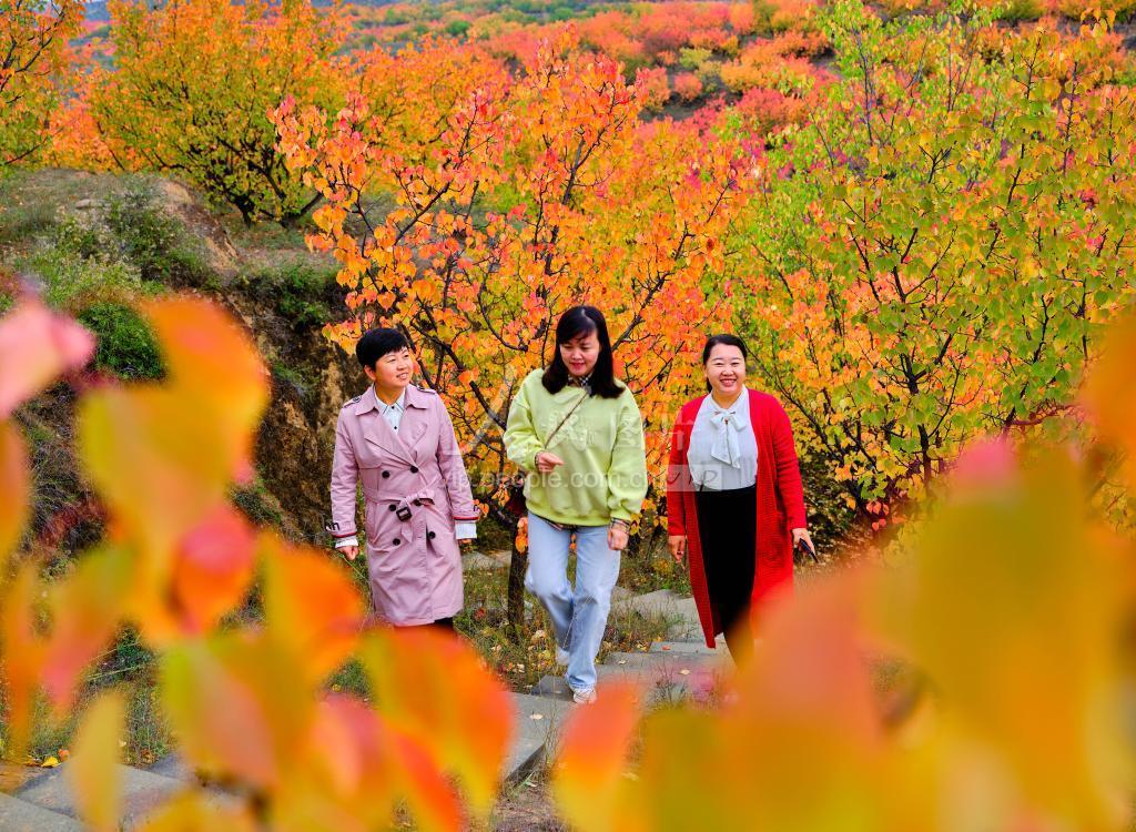 10月14日,游客在陕西省榆林市榆阳区古塔镇杏树岭油画般的秋日美景中留影。