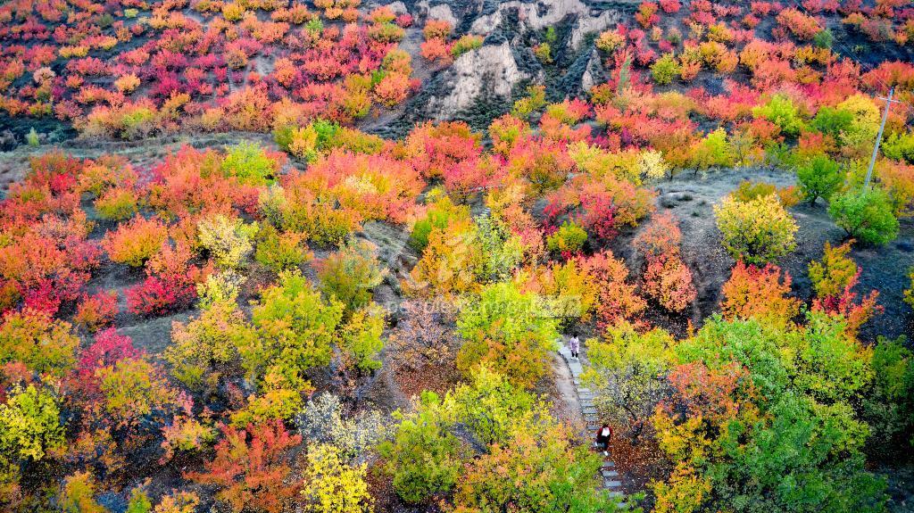 2021年10月14日,一场秋雨刚过,陕西省榆林市榆阳区古塔镇杏树岭的数万亩杏林,在经过雨水的洗涤、阳光的映照下,似团团火焰、片片彩霞,各种颜色互相交织,勾勒出一幅诗情画意、浪漫唯美、色彩斑斓的画卷,营造了一幅油画般的秋日美景。