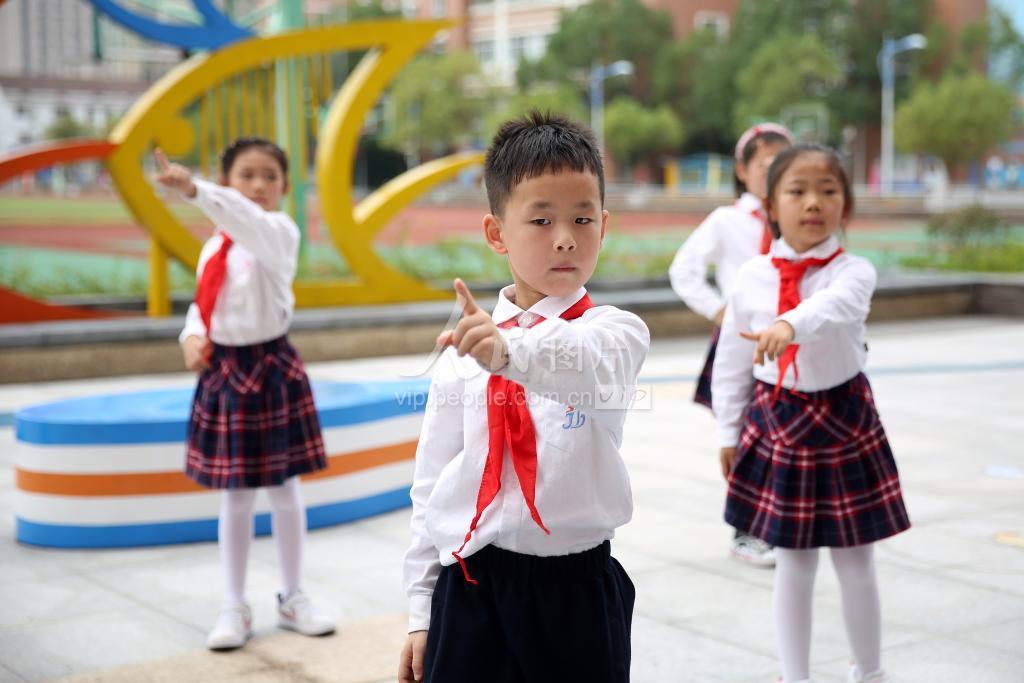 2021年10月14日,浙江省东阳市江北中心小学操场上,伴随着欢快的音乐声,老师带领学生正在做“无接触眼保健操”。