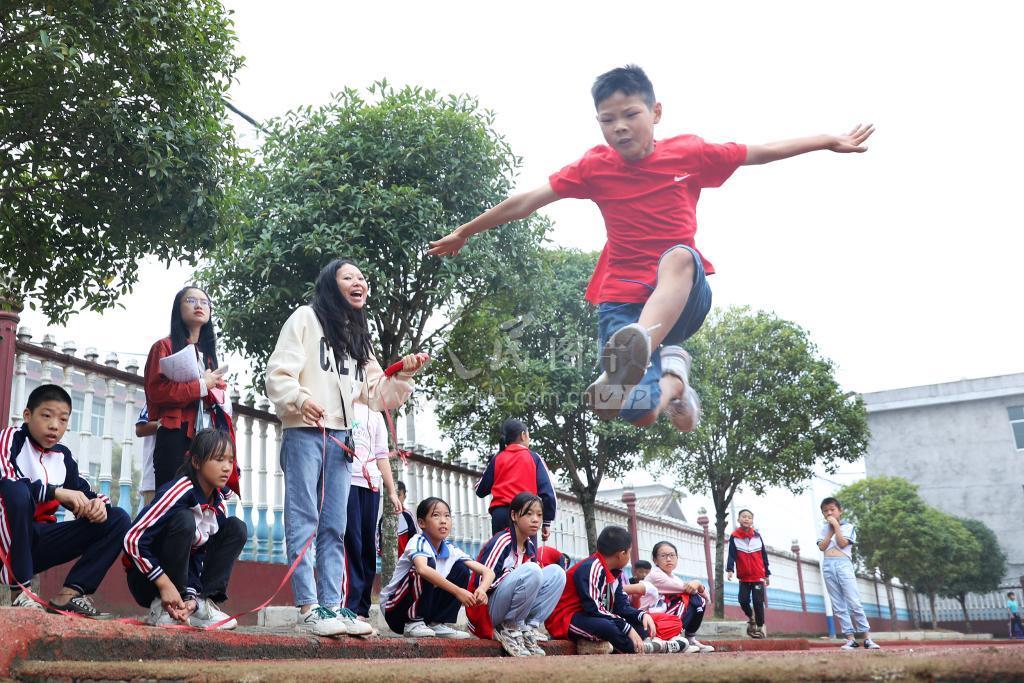 图片说明: 2021年10月14日,江西省宜春市上高县田心中心小学,孩子们在参加跳远比赛。