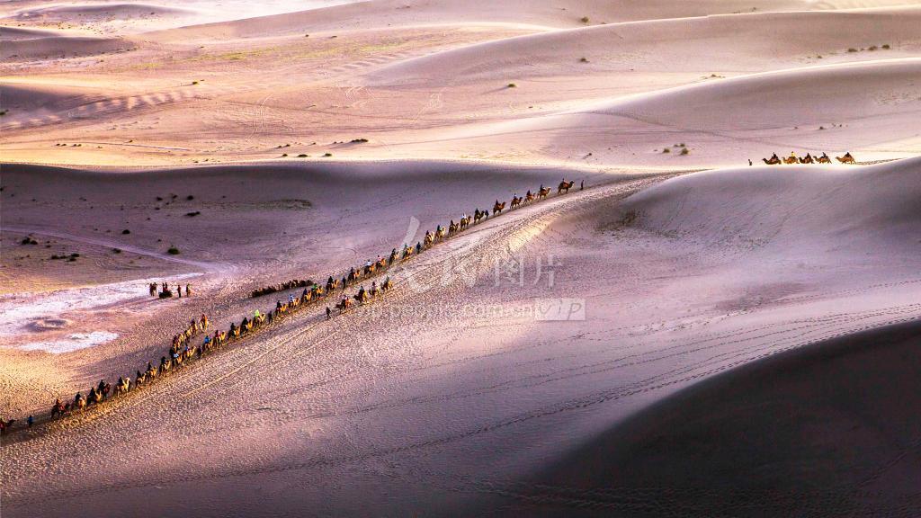 2021年10月15日,甘肃省酒泉市敦煌市鸣沙山,游客们正在骑行穿越沙漠旅游。 敦煌市利用得天独厚的地理环境和沙漠资源优势,不断优化旅游环境,拓展开辟旅游渠道,组织游客进行深度沙漠游览,促进了旅游产业振兴。