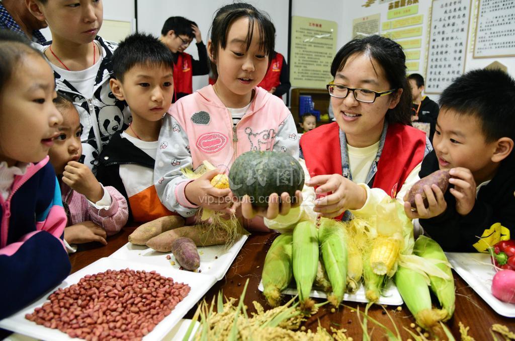 2021年10月16日,在江苏省镇江市回龙社区,江苏科技大学志愿者在为小朋友讲解南瓜的功用和生长过程。