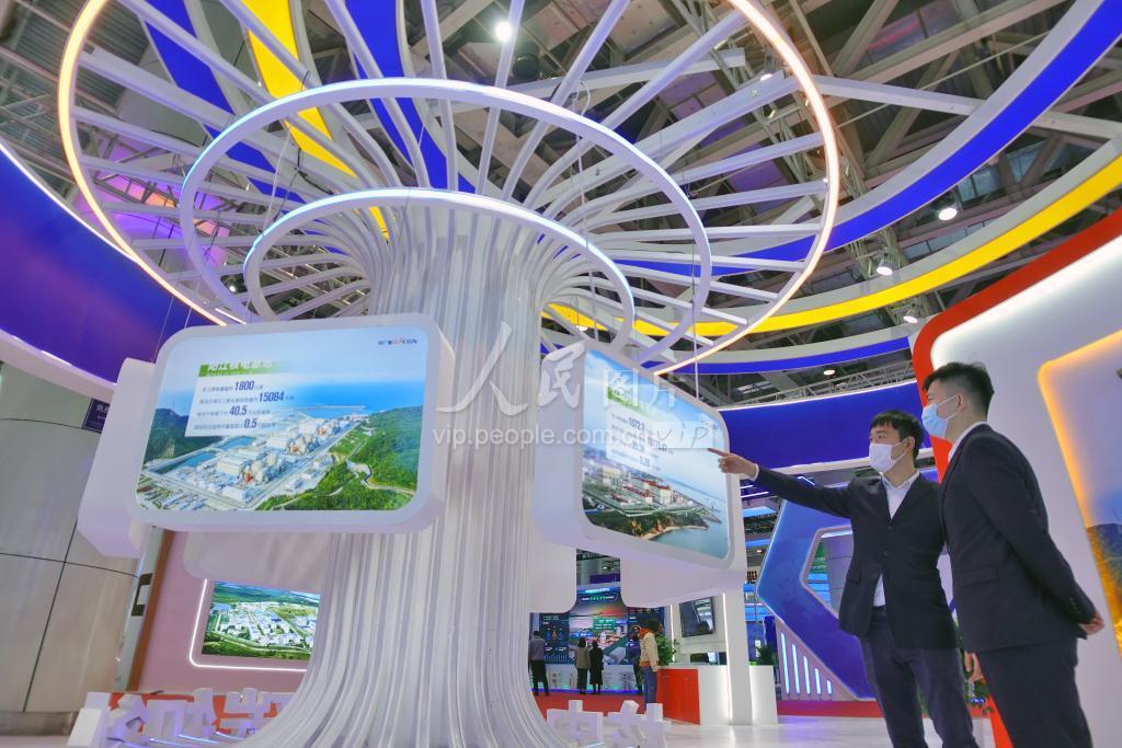10月19日,观众(右)在2021中国国际核电工业及装备展览会上了解中国核电基地情况。