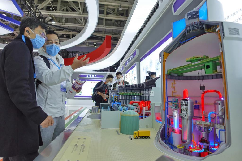 10月19日,观众(右)在2021中国国际核电工业及装备展览会上了解“国和一号”核电机组模型。