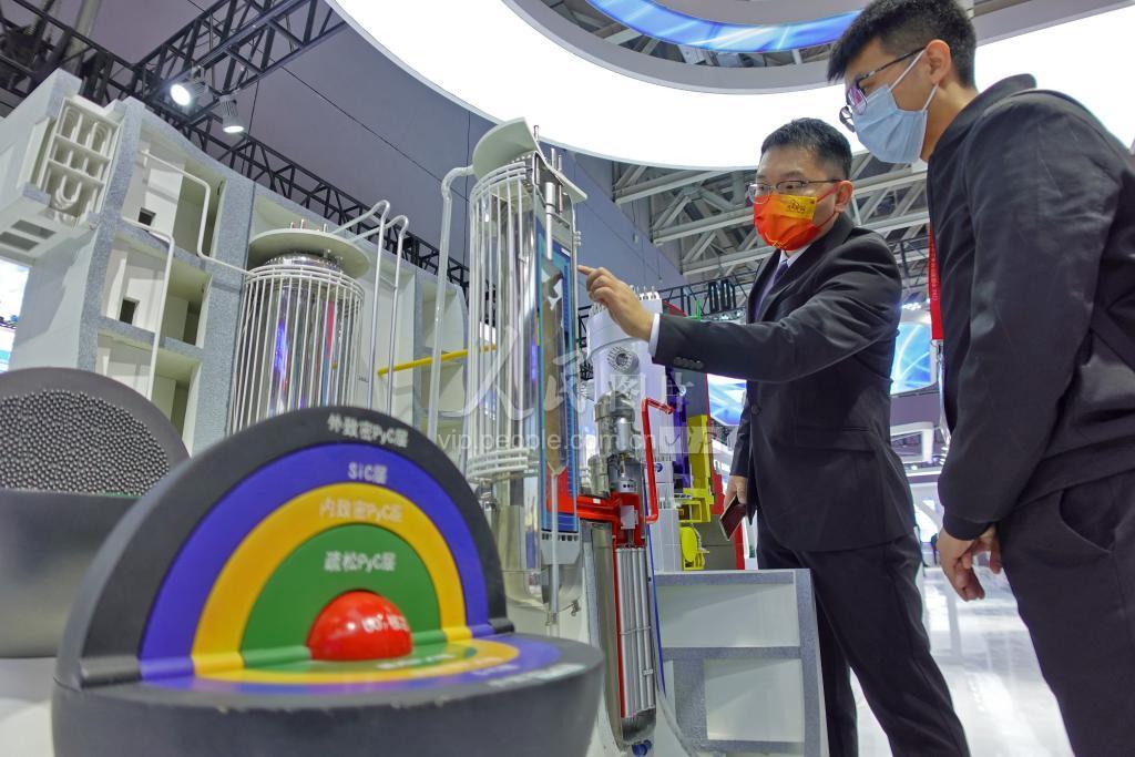 10月19日,观众(右)在2021中国国际核电工业及装备展览会上了解华能高温气冷堆模型。