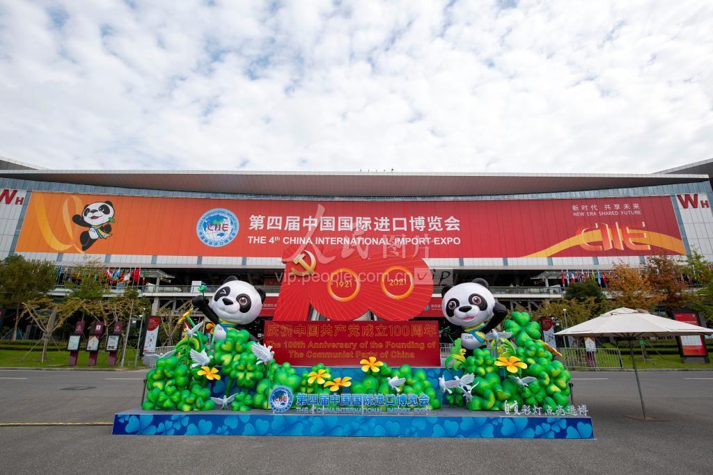 2021年11月4日,国家会展中心(上海)南广场,大型花坛内鲜花怒放,各国国旗迎风招展。据悉,第四届中国国际进口博览会将于11月5日至10日在上海举办,目前各项工作已准备就绪。