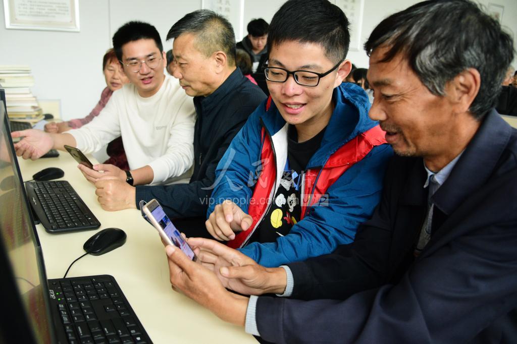 2021年11月5日,在江苏省镇江市官塘桥街道“平平银发智能课堂”,江苏大学志愿者在指导老年人学习使用智能手机上网购物技能。