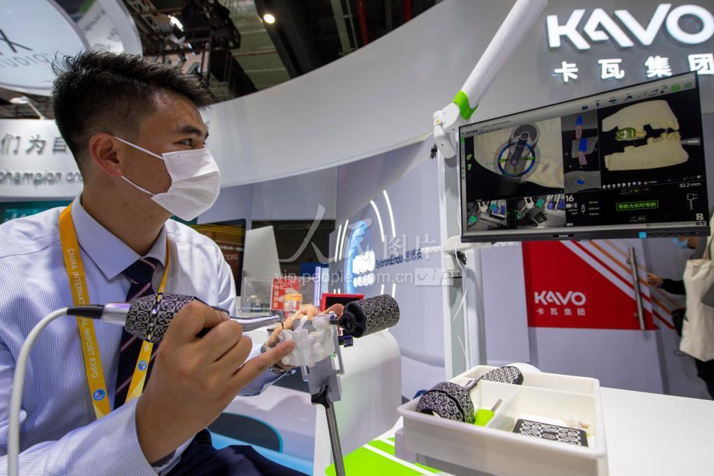 11月5日,在进博会医疗器械及医药保健展区,工作人员正在操作展示X-Guide三维动态种植导航仪,相比徒手种植,使用它精准性可提升11倍。