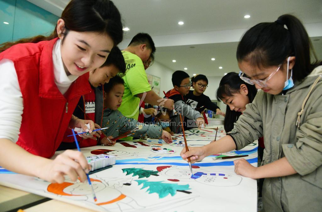 2021年11月6日,江苏科技大学志愿者与镇江市平山村和宝平社区的小朋友一起绘制“迎北京冬奥会”主题长卷。
