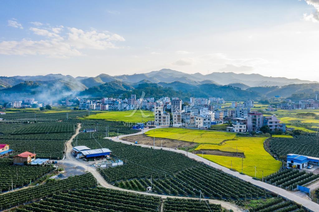 2021年11月6日,航拍广西梧州岑溪市归义镇暮秋金黄的稻田、绿色产业的火龙果、乡村民居与绿水青山环抱相映成趣,构成一幅美丽乡村画卷,美不胜收。 近年来,岑溪市坚持把生态宜居作为脱贫攻坚和乡村振兴的关键,持续推进宜居宜业美丽乡村建设,建设了一批乡村旅游新景点。