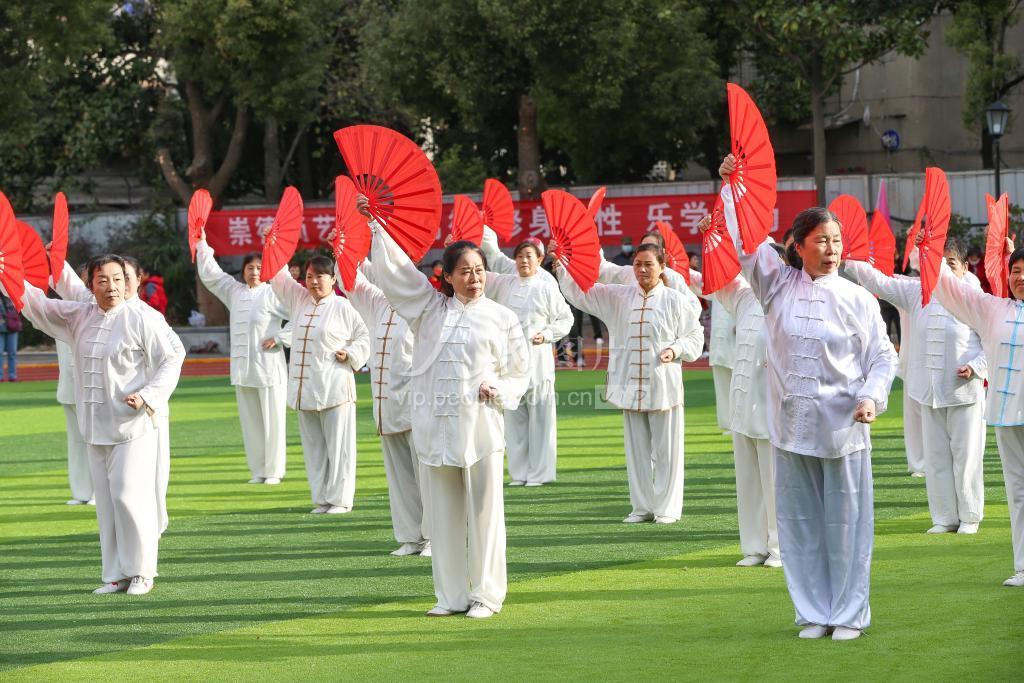 2021年11月11日,湖北省襄阳市,襄阳市老年大学运动会上,运动员们在进行团体太极扇展示。