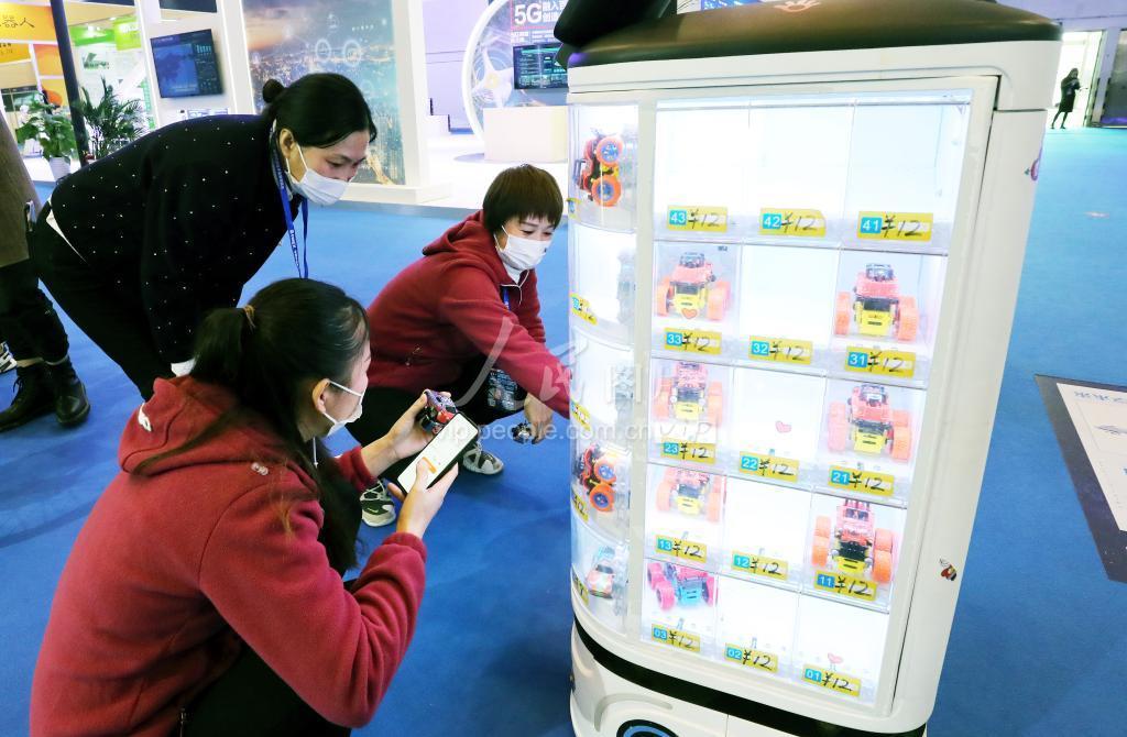 2021年11月20日,苏州市民们在电博会上体验自动购物。