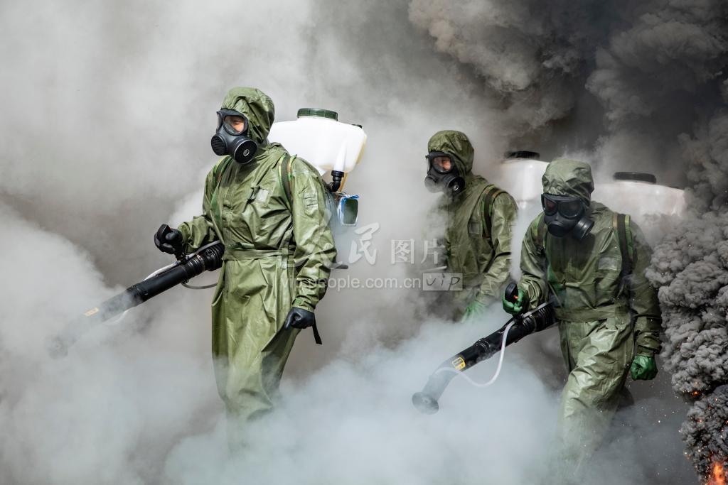 2021年11月25日,武警防化兵携带便携式洗消器对染毒区域进行洗消。