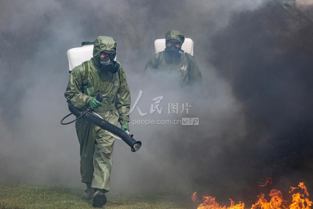 2021年11月25日,武警防化兵携带便携式洗消器对染毒区域进行洗消。