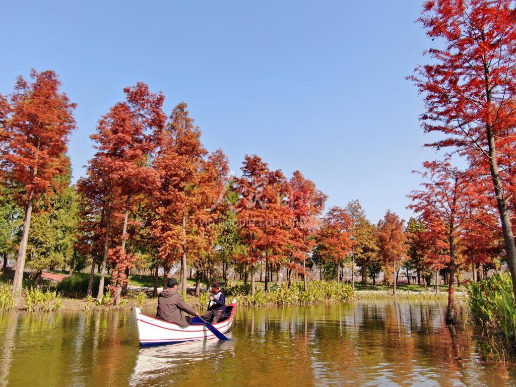 2021年11月25日,工作人员在江苏省南通市通州区五接镇洲际梦幻岛池杉林中测试欧式手划船。