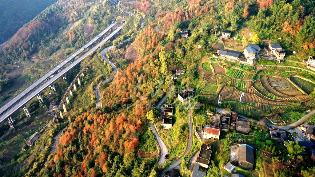2021年11月25日,重庆市万盛经济技术开发区砚石台矿区,层林尽染,道路、青山绿野和农房相映成趣,美不胜收。