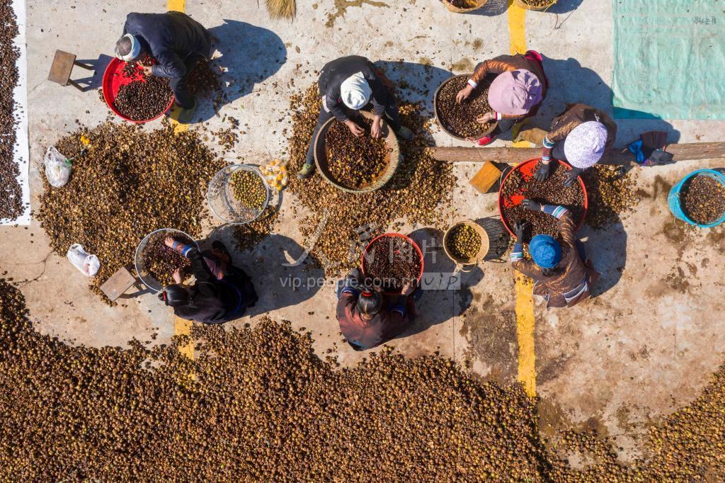 2021年11月25日,在贵州省从江县谷坪乡银下侗寨,村民在对鲜果油茶果进行剥壳、分拣、晾晒。