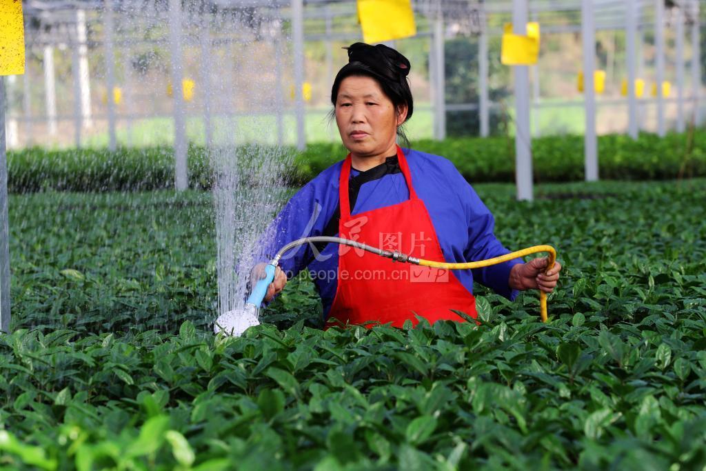 11月25日,村民在贵州省黔东南苗族侗族自治州榕江县古州镇车江大坝百香果育苗基地给百香果苗浇水。