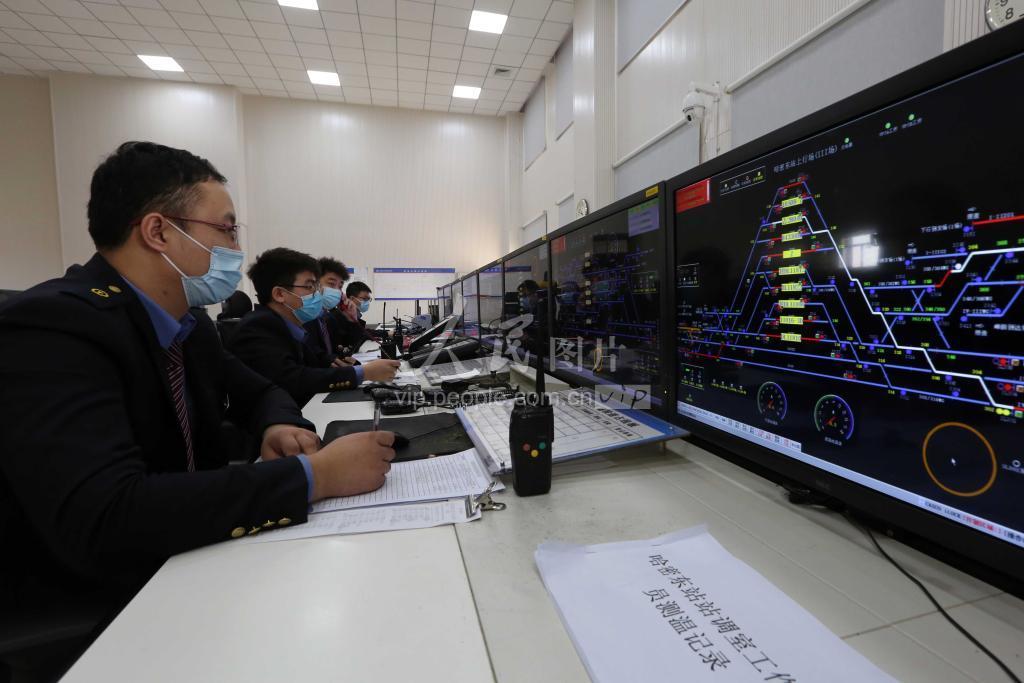 2021年11月24日,工作人员在兰新铁路哈密东站调度指挥到发列车。