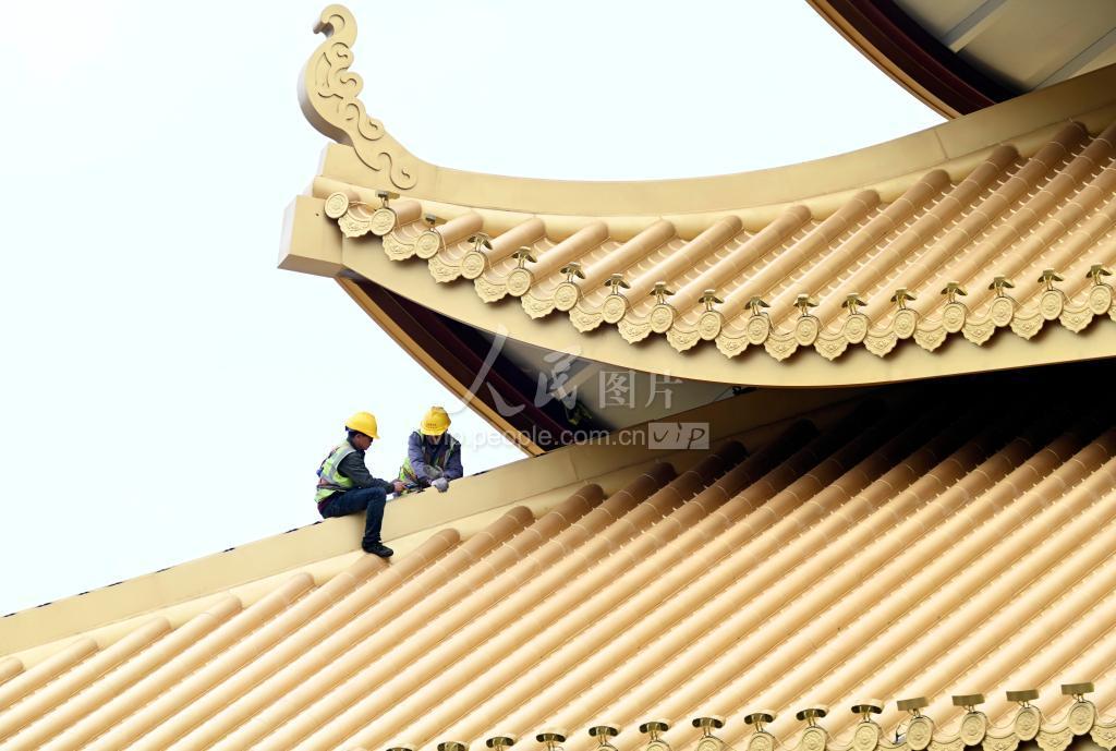 2021年11月24日,工人在柳州凤凰岭大桥风雨亭上铺设铜瓦。