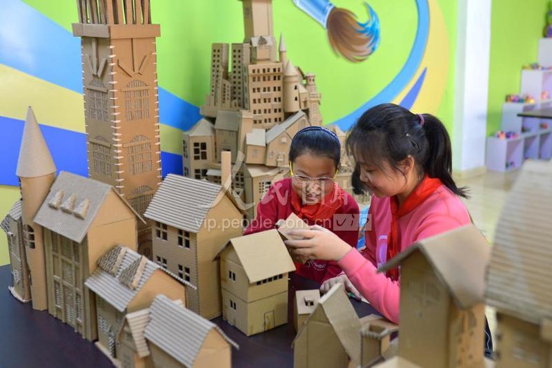2021年11月26日,在山东省青岛市人民路第二小学“倡环保 爱手工”主题创作活动上,两名学生利用搜集的纸板制作箱板雕刻装置。