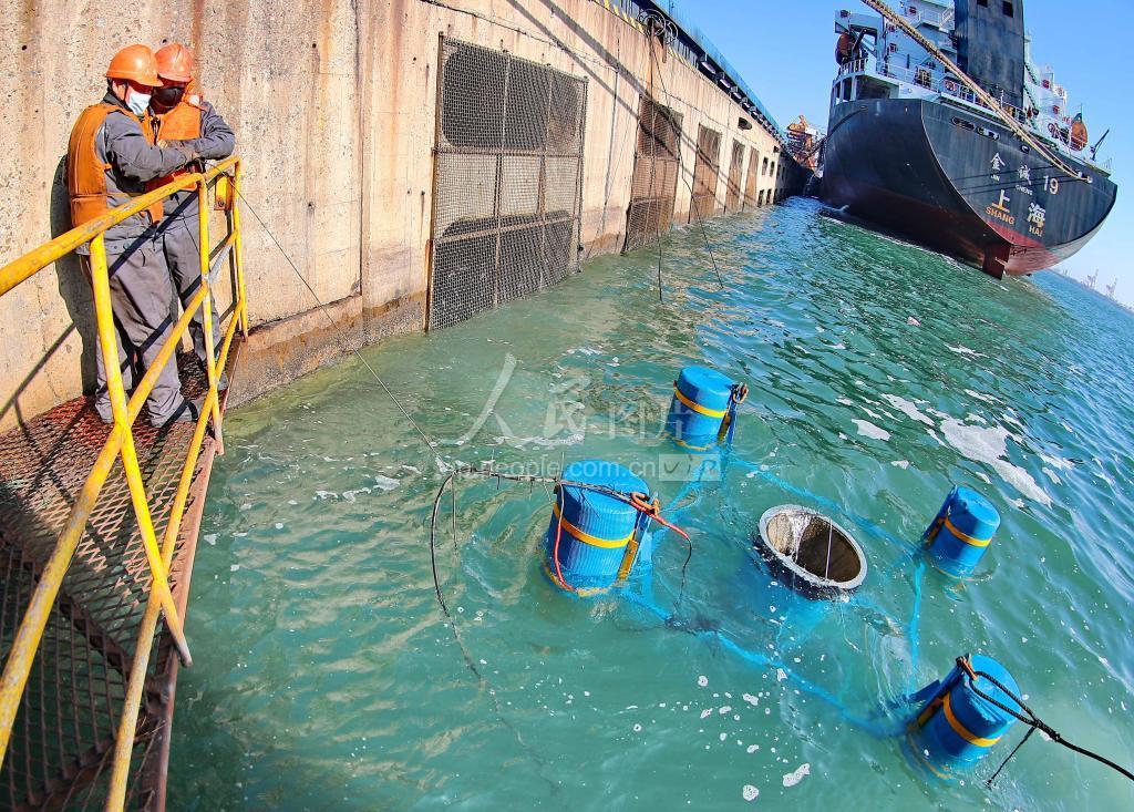 2021年11月26日,位于河北港口集团秦皇岛港东港区港池内,工人正在整理维护“海洋垃圾桶”。