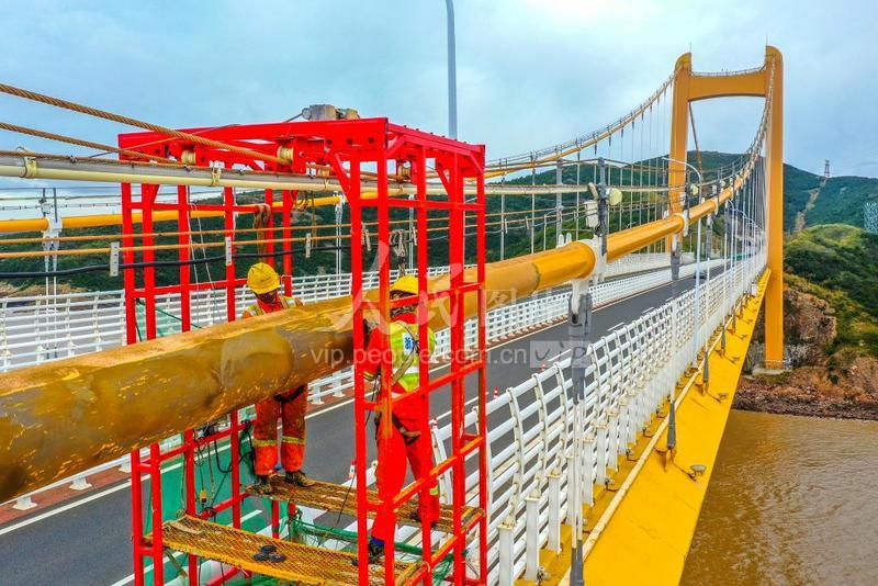 2021年11月28日,浙江交通集团交工养护工人在岱山官山大桥上为主缆作最后一个施工段的除污涂装,舟山市首个对桥梁缆吊系统运用OTC技术防腐修复工程进入收尾施工。