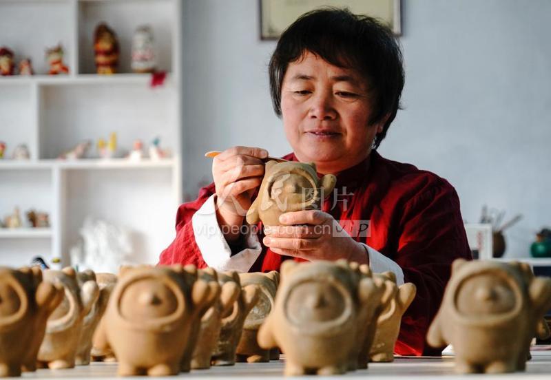 2021年11月28日,河北省唐山市玉田县亮甲店镇泥塑艺人魏艳华在修整2022年北京冬奥会吉祥物泥塑作品泥坯,准备进行着色。
