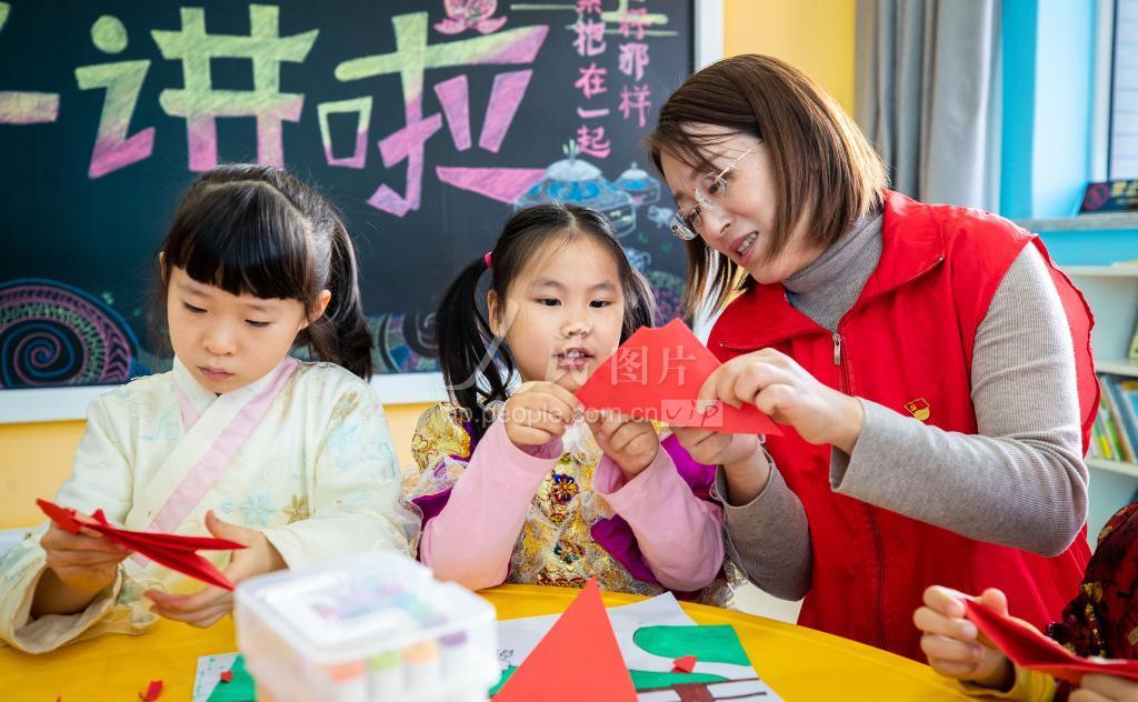 2021年12月3日,内蒙古呼和浩特市玉泉区梁山街社区党员志愿者指导辖区小朋友制作传统窗花。