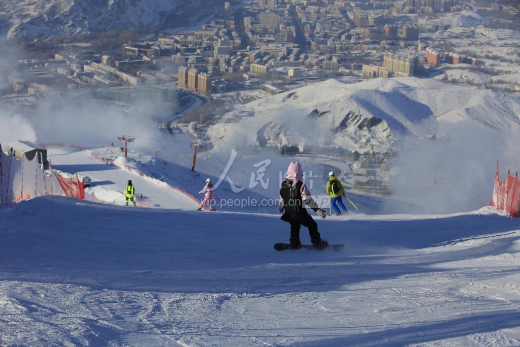 2021年12月10日,新疆阿勒泰市将军山滑雪场,游客正在滑雪,体验冰雪运动的魅力。