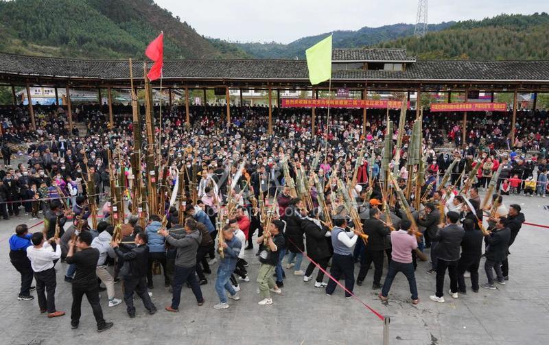 12月12日,在广西融水苗族自治县双龙沟梦呜苗寨,2支芦笙队在比赛中。