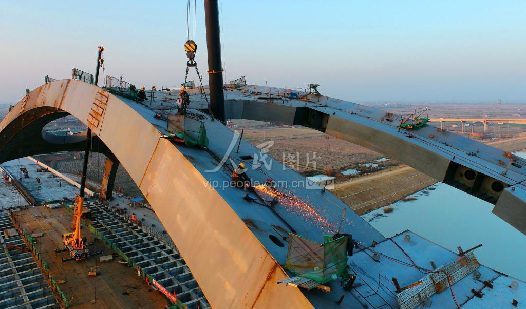 2021年12月21日,安徽省合肥市庐江县罗埠河特大桥施工现场,工程建设者正在大型机械辅助下进行桥梁主跨配套设施作业。