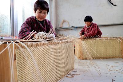 2021年12月28日,山东省滨州市博兴县锦秋街道湾头村村民在编织草柳编产品。