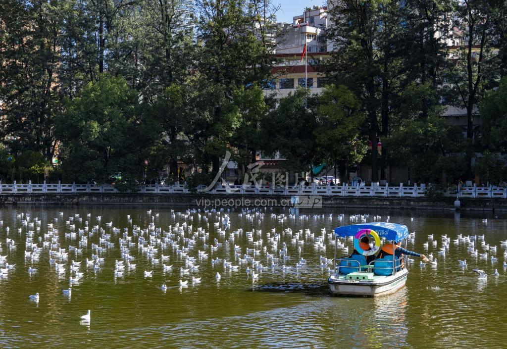 2022年1月2日,游客前来昆明翠湖公园游玩。每年冬季,数万只红嘴鸥从遥远的北方飞来昆明越冬,翠湖公园则是昆明城区一处主要的观鸥点,漫天飞舞的红嘴鸥与欢乐的游人组成了一幅和谐美丽的画卷。