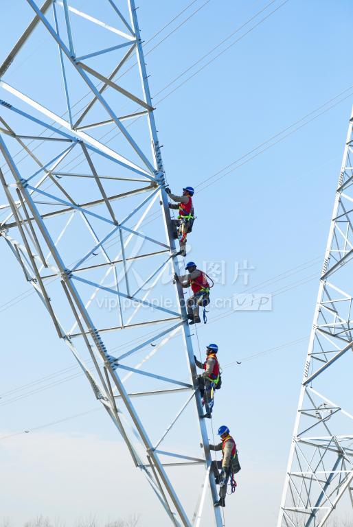 2022年1月3日,在安徽省滁州市全椒县220千伏八波输变电工程建设工地,电力工人在向70多米高空攀爬进行组塔作业。