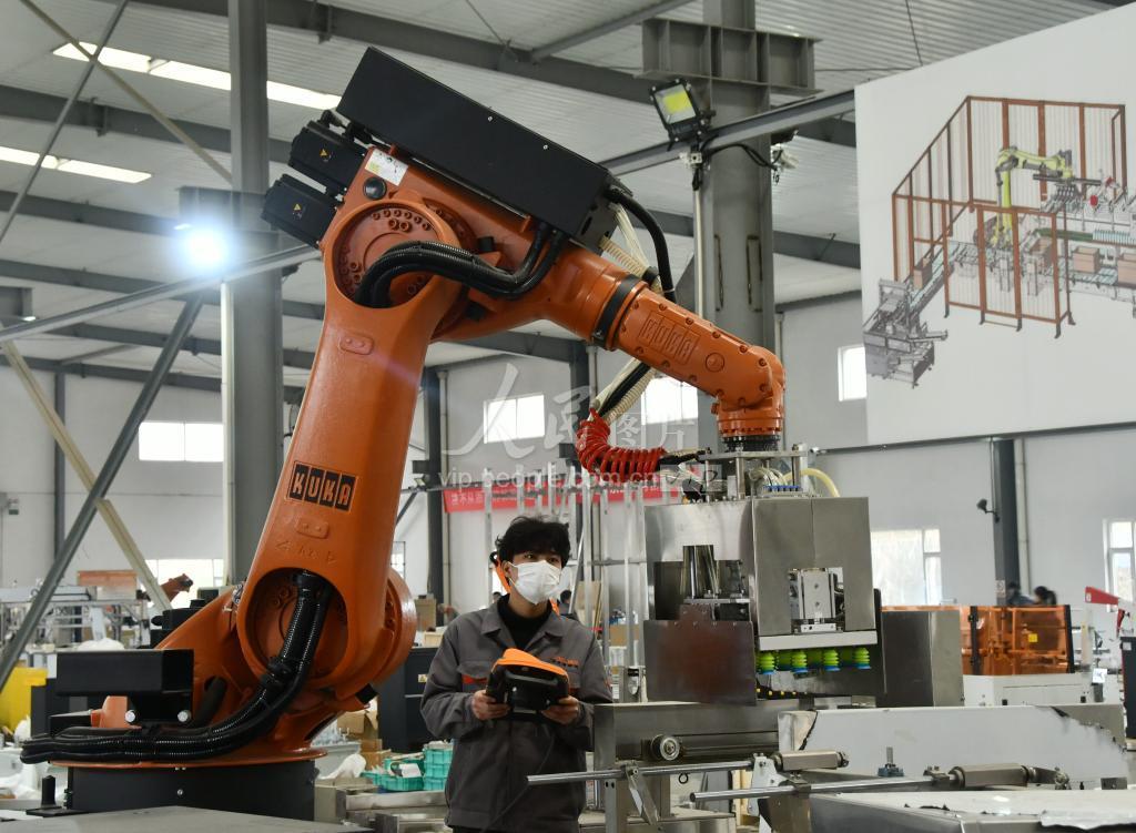 2022年1月5日,在位于河北省邯郸市永年区工业园区的河北博柯莱智能装备科技股份有限公司,工作人员正在调试机器人抓手。