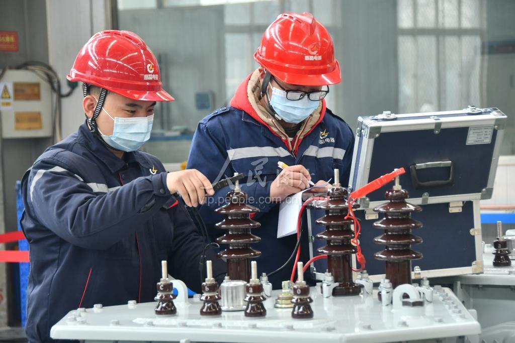 2022年1月5日,在位于河北省邯郸市永年区工业园区的河北高晶电器设备有限公司,工人正在车间检测变压器。