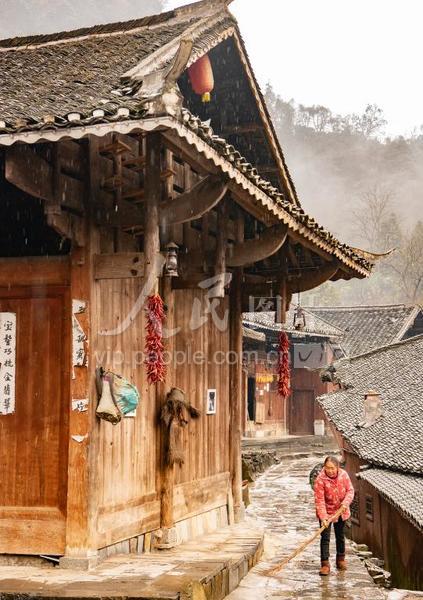 2022年1月6日,沅陵县借母溪乡借母溪村民在房前打扫卫生。