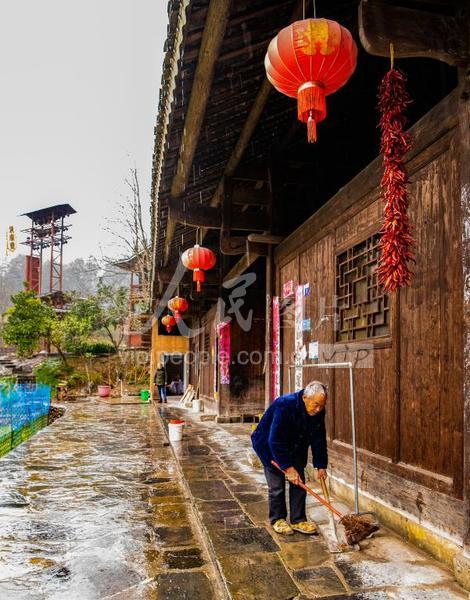 2022年1月6日,沅陵县借母溪乡借母溪村民在房前打扫卫生。