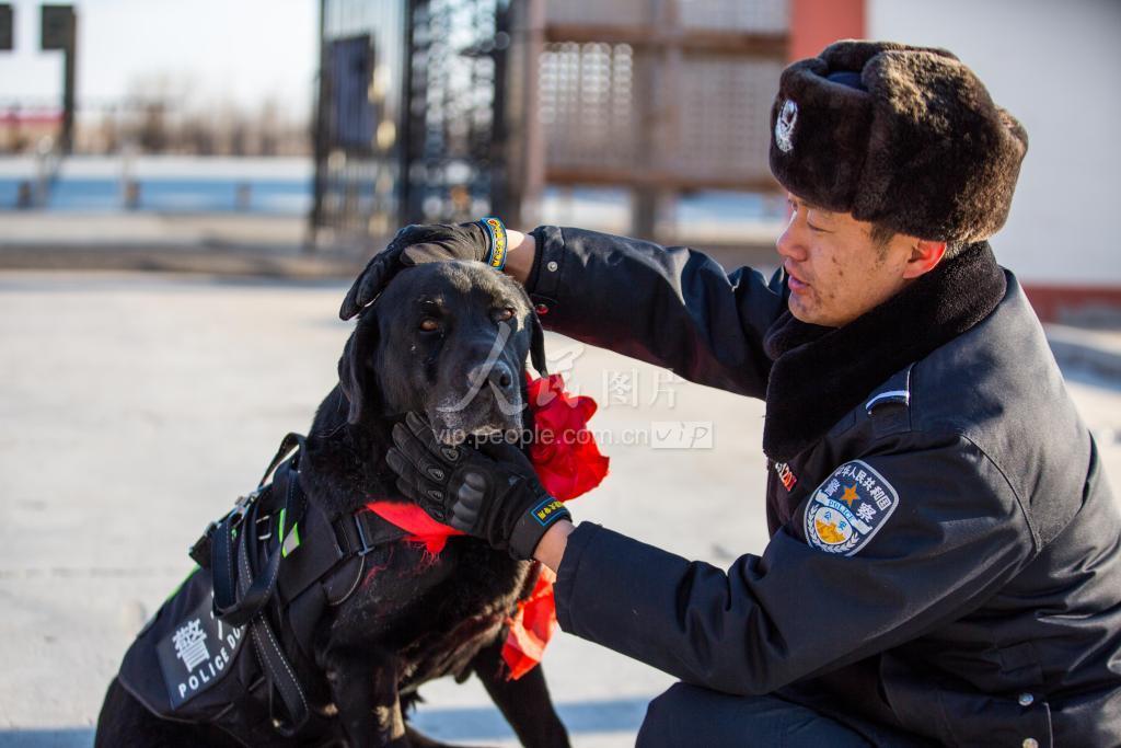 2022年1月7日,内蒙古出入境边防检查总站二连出入境边防检查站警犬技术分队,为9头警犬举行隆重的退役仪式。训导员为朝夕相处的警犬佩戴上象征着光荣的大红花,开展最后一次训练、最后一次巡逻和向战位告别活动,向为移民管理事业奉献一生的“无言战友”致以最崇高的敬意。