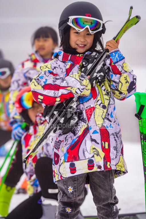 1月9日,学生手捧滑雪板,露出开心的笑容。