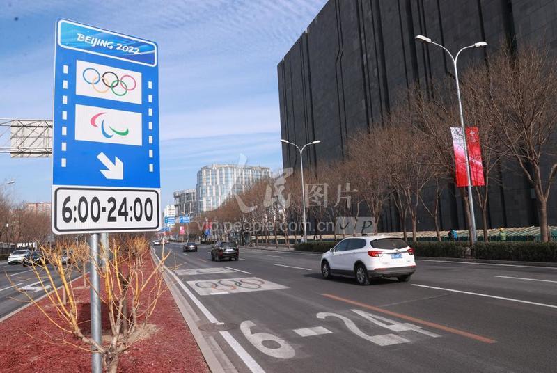 2022年1月8日,在北京朝阳区北辰西路拍摄的北京2022年冬奥会、冬残奥会专用车道标志牌。