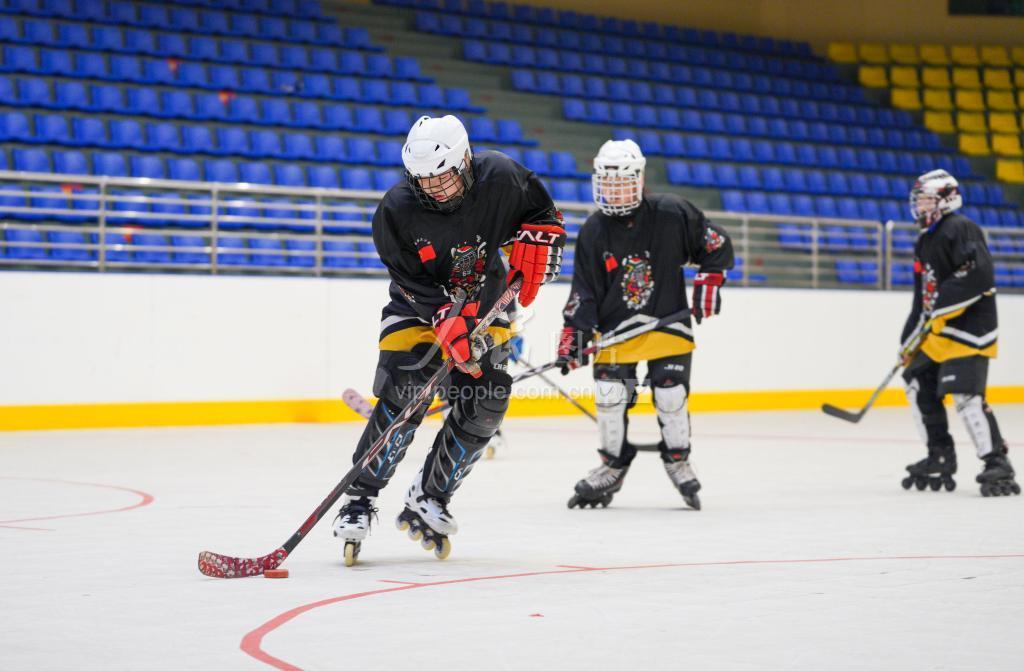 2022年1月10日,江西省赣州市石城县体育馆训练场上,石城县第三小学的陆地冰球队员们正在进行冰球比赛。 近年来,石城县持续推动青少年冰球运动发展,随着冬奥会的临近,越来越多的青少年加入到冰球运动中,感受冰雪运动带来的魅力。