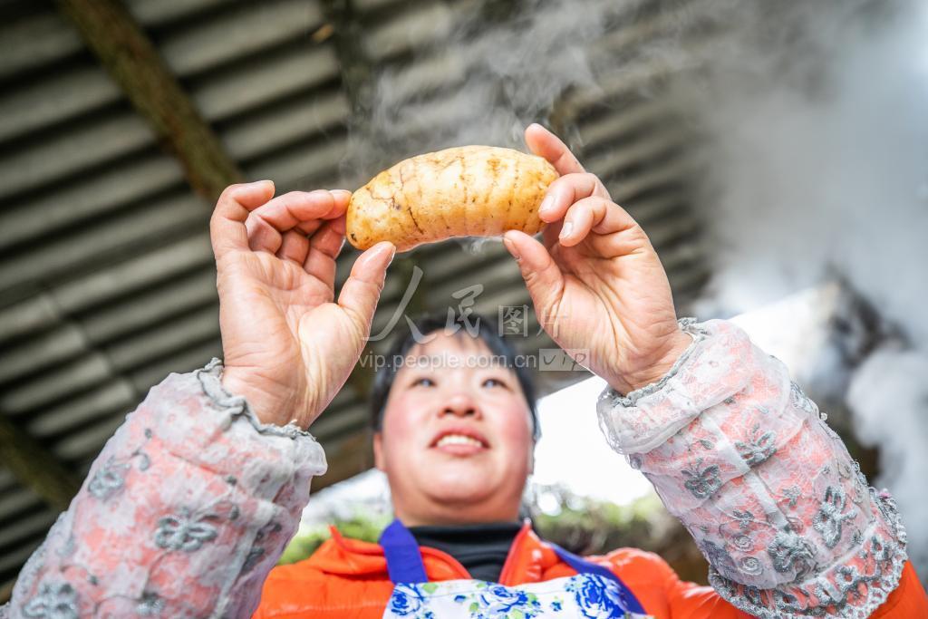 2022年1月12日,在贵州省毕节市七星关区杨家湾镇营盘村,村民正在查看天麻的蒸制情况。