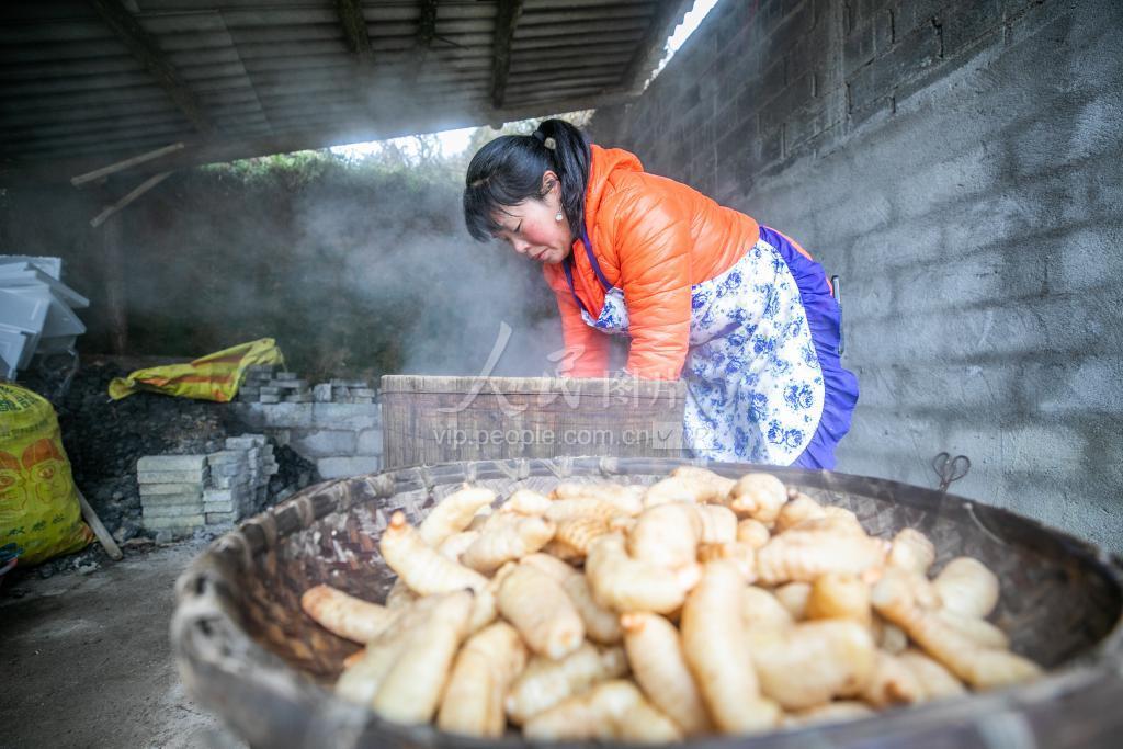 2022年1月12日,在贵州省毕节市七星关区杨家湾镇营盘村,村民正在取出蒸熟的天麻。