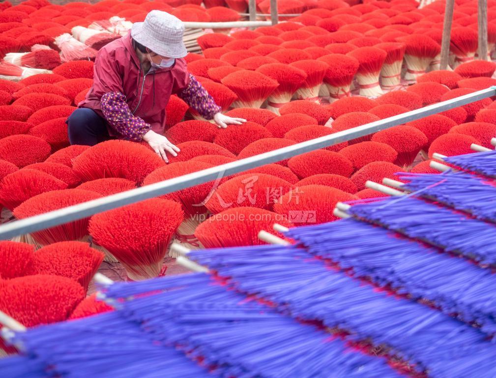 2022年1月14日,湖南省永州市江华瑶族自治县涛圩镇制香产业园,工人在赶制篾香。农历虎年临近,当地制香企业工人忙着制香晒香,确保如期完成海内外订单。近年来,江华县大力发展制香产业,通过线上、线下销售渠道,产品远销国内、非洲等海内外众多国家和地区。